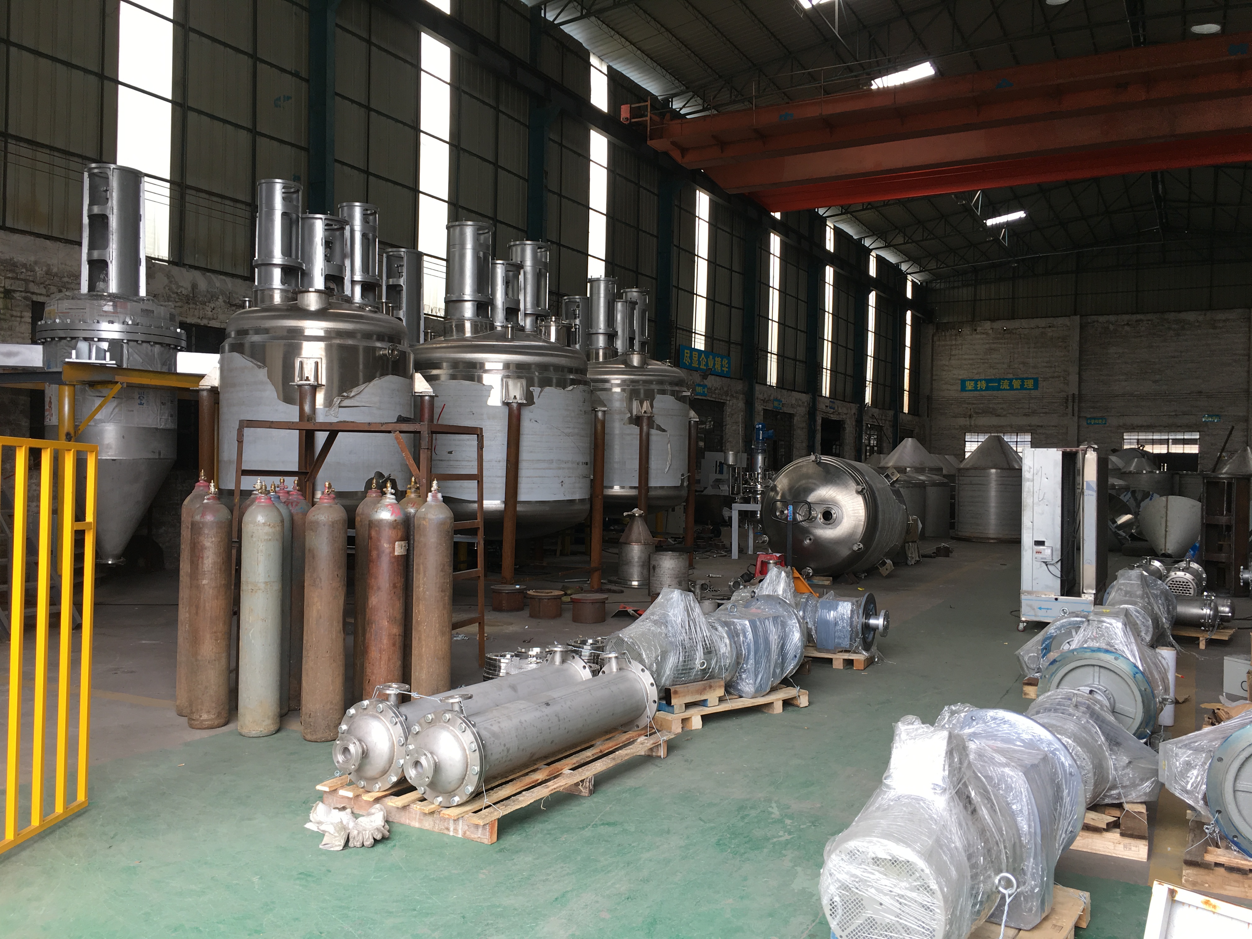 設(shè)備生產(chǎn)概況:(不銹鋼反應(yīng)釜、高溫釜、多功能分散釜、高速分散攪拌釜、電加熱反應(yīng)釜的焊接、組裝、試機(jī)等情況)