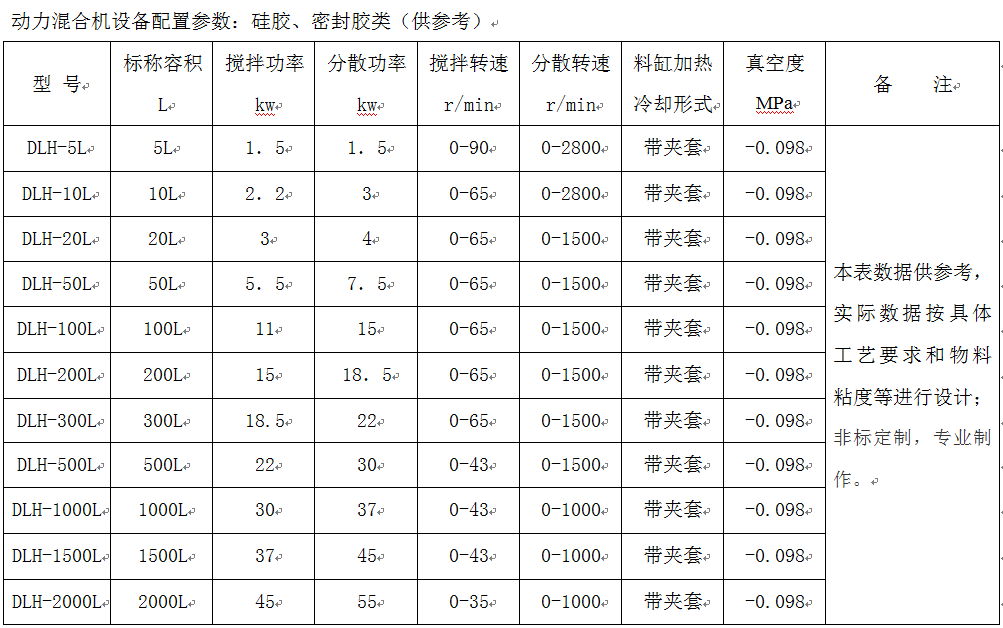 MS密封膠行星動力混合機(jī)|真空攪拌機(jī)配置參數(shù)表:(常規(guī)的容量、功率、轉(zhuǎn)速等數(shù)據(jù)表,其它更大容積的未作描寫)